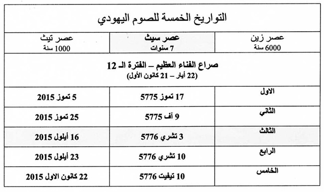 الشعب اليهودي هم ابناء نوح ، نوح وبني اسرائيل كان لهم تقويم يتضمن " تموز" في ذلك التقويم اكتشفت الحدود الاربعة الاخرى التي حددت تاريخ صراع الفناء. انها ضمن الاعياد اليهودية.