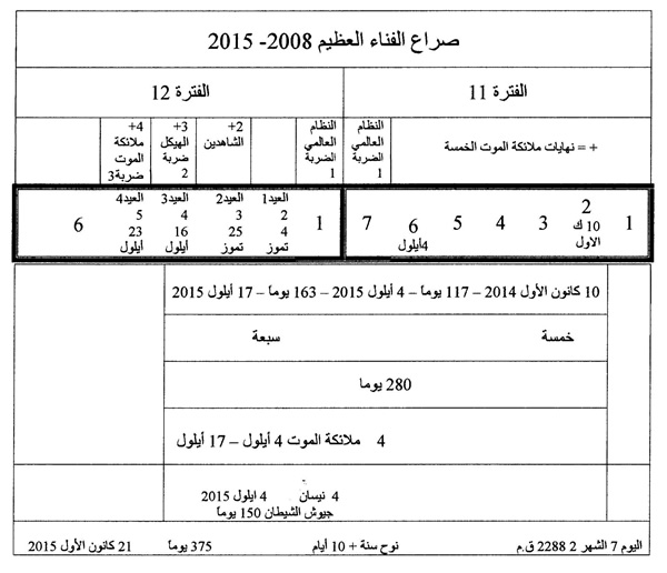 استطعت ذلك ايضاً حين وجدت " وتدَي " تموز لـ جدول 7000 سنة من التاريخ البشري الاول ظهر في ايام نوح وطوفانه ، والثاني عند دمار الهيكل الاول في العام 588 ق. م بينهما اكتشف " الترس " الكبير (مقياس تموز الكبير) 1715 سنة. لنطبق هذه المعادلة نقارن نمط احداث 7000 سنة مع مبدأ ان 1000 سنة تساوي يوم واحد لفتح دورة 7 سنوات لصراع الفناء (بطرس الثانية 3: 8 ، مزامير 90 : 4).